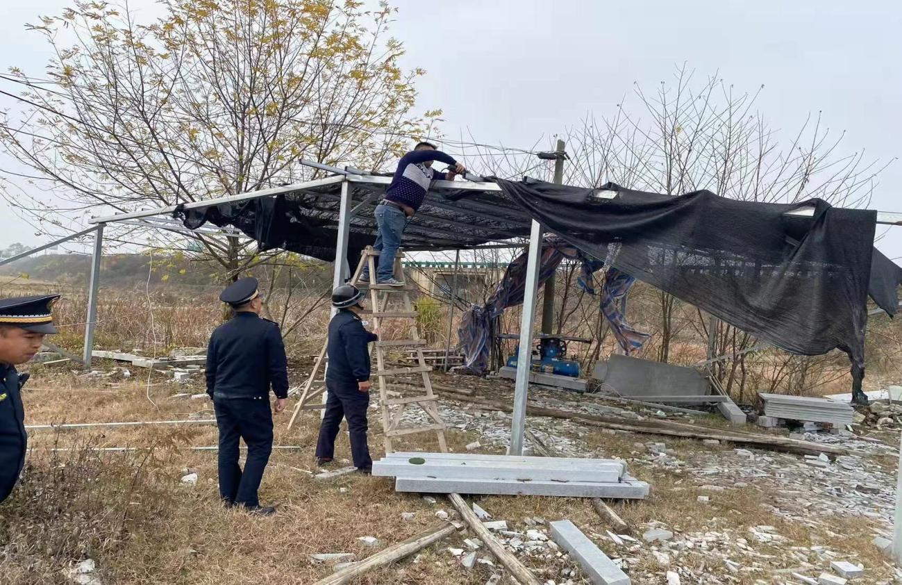 为进一步加强辖区控违安全监管工作,杜绝安全事故发生。12月14日上午,开发区·铁山区城管出动10余名队员对位于集会村、柯畈村的2处历史违法搭建的钢架棚依法进行了拆除,拆除面积约170平方。下一步,城管队员将不断加大巡查管控力度,加强违法建筑安全隐患排查整改,对于违法建设行为,采取“零容忍”的态度,坚决将违法建筑控制在萌芽状态。(曹志芳)