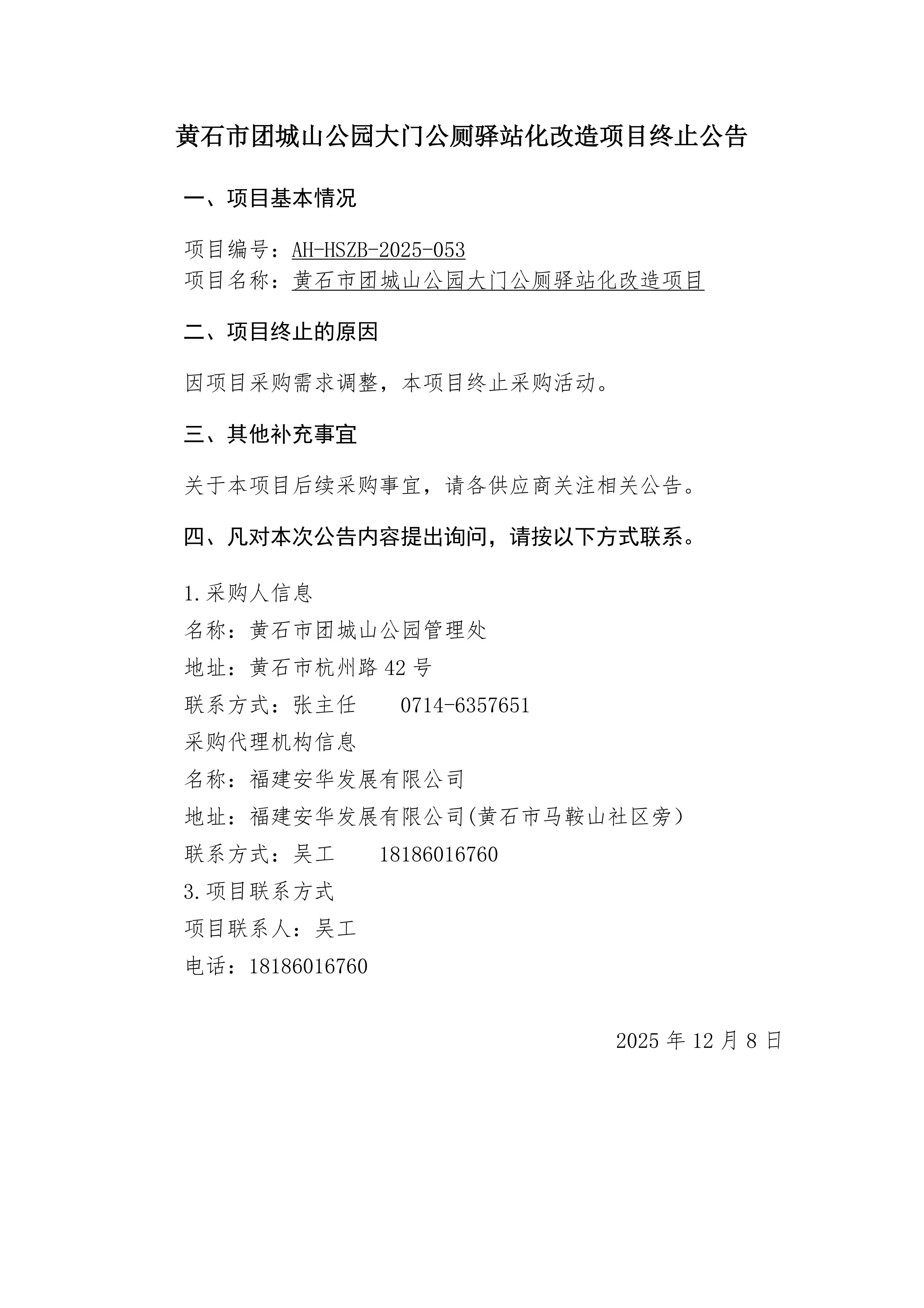 黄石市团城山公园大门公厕驿站化改造项目终止公告