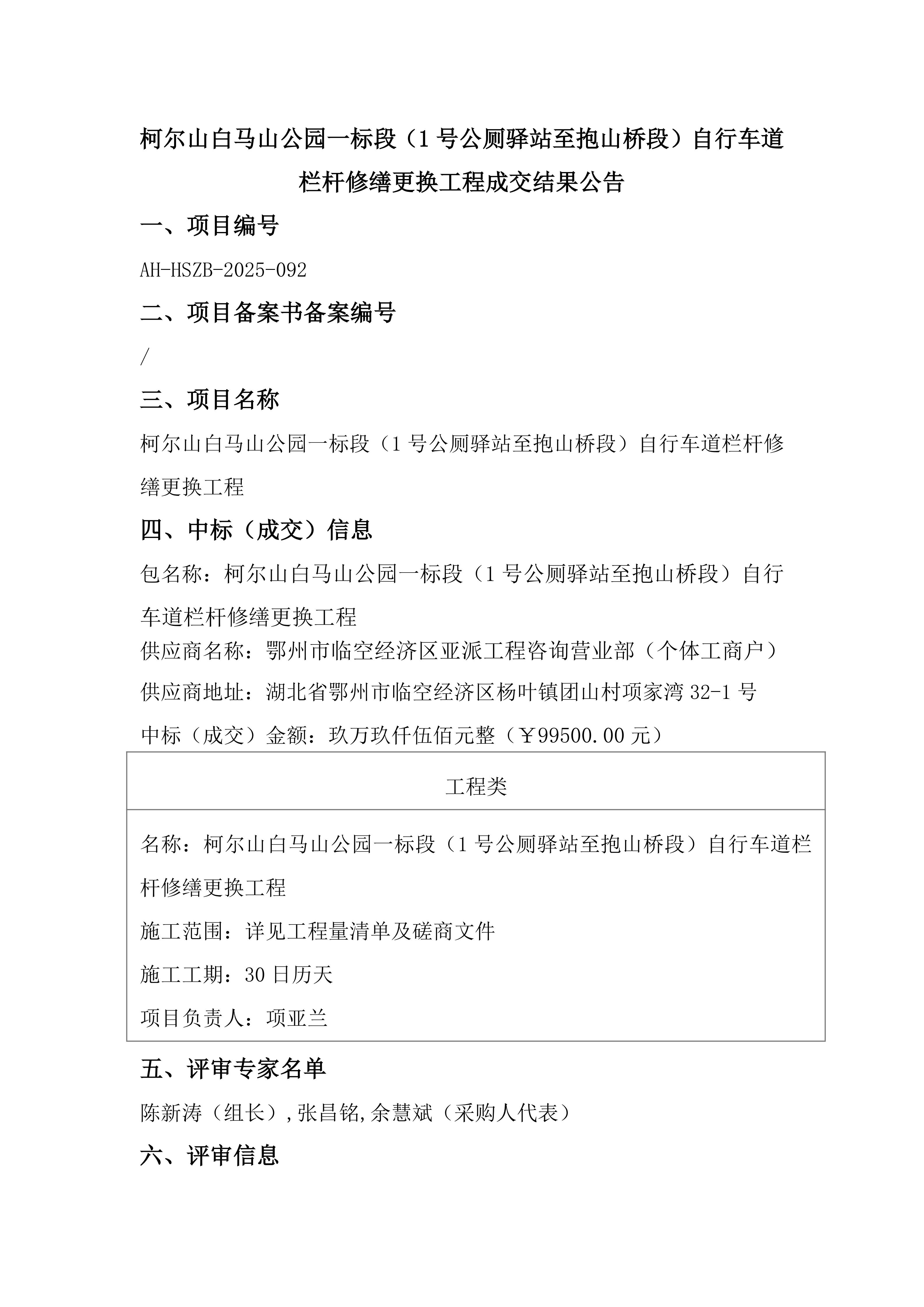 柯尔山白马山公园一标段(1号公厕驿站至抱山桥段)自行车道栏杆修缮更换工程成交结果公告