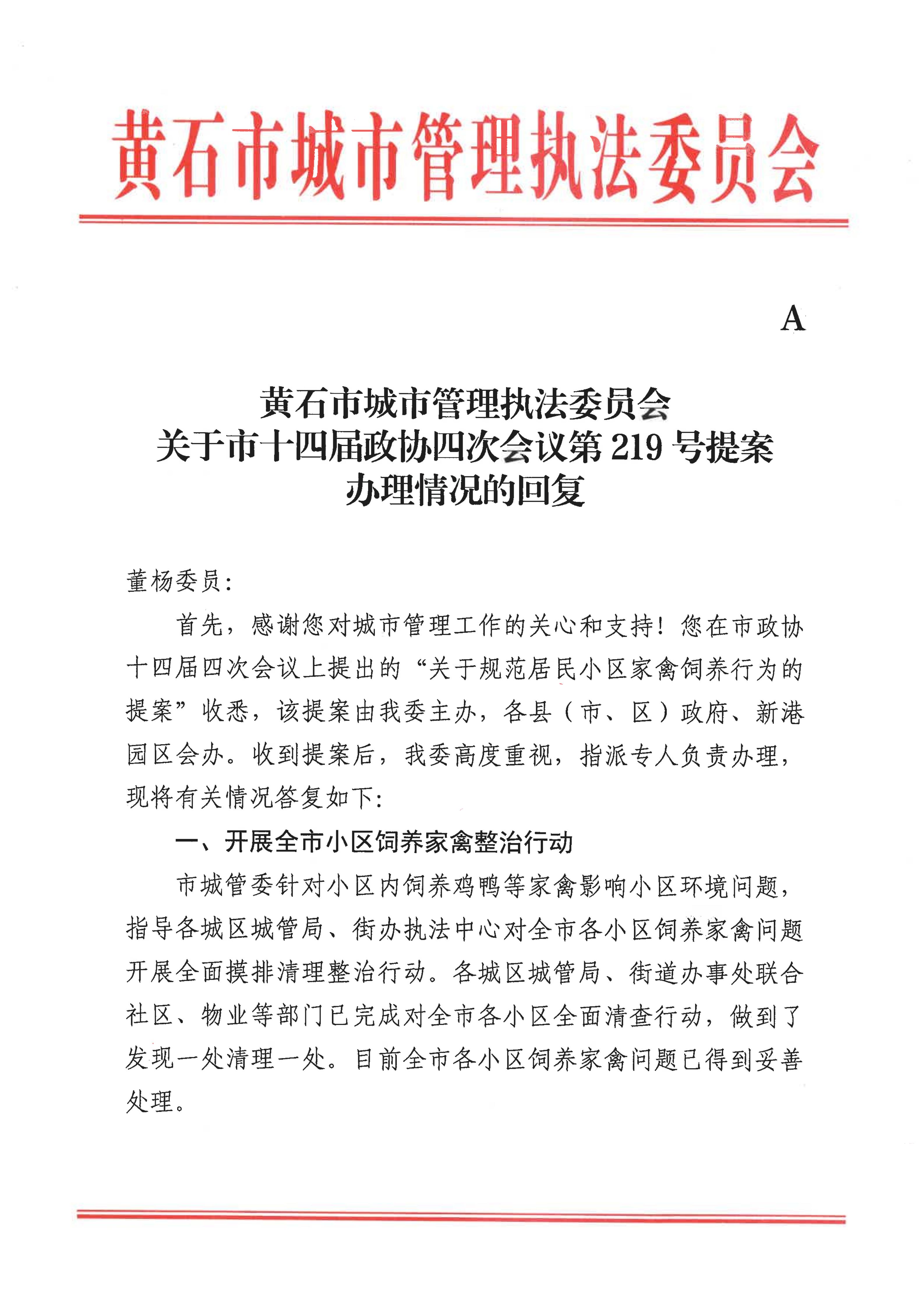 黄石市城市管理执法委员会关于市十四届政协四次会议第219号提案办理情况的回复