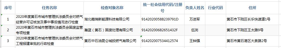 黄石市城市管理执法委员会2020年“双随机、一公开”行政检查台账