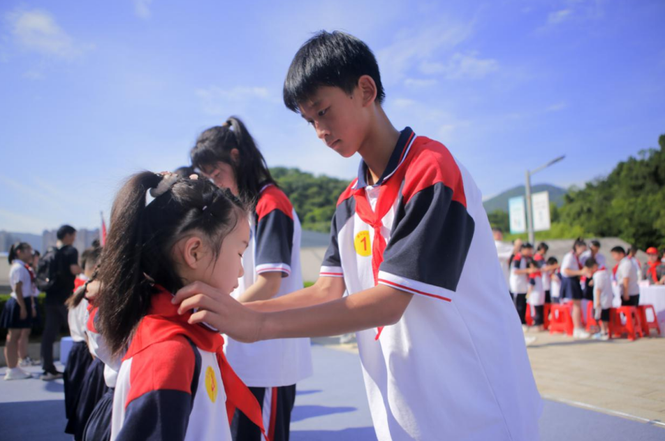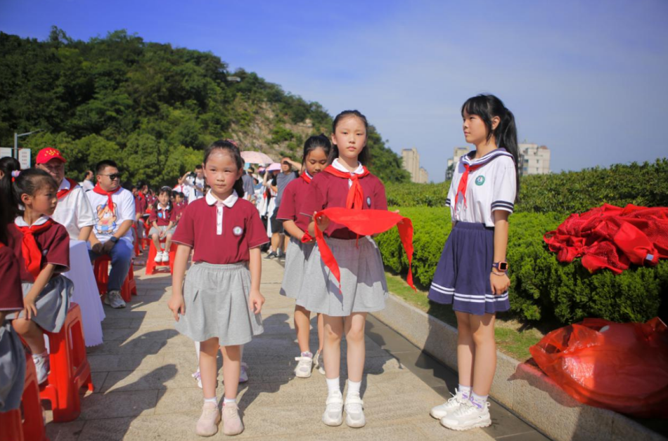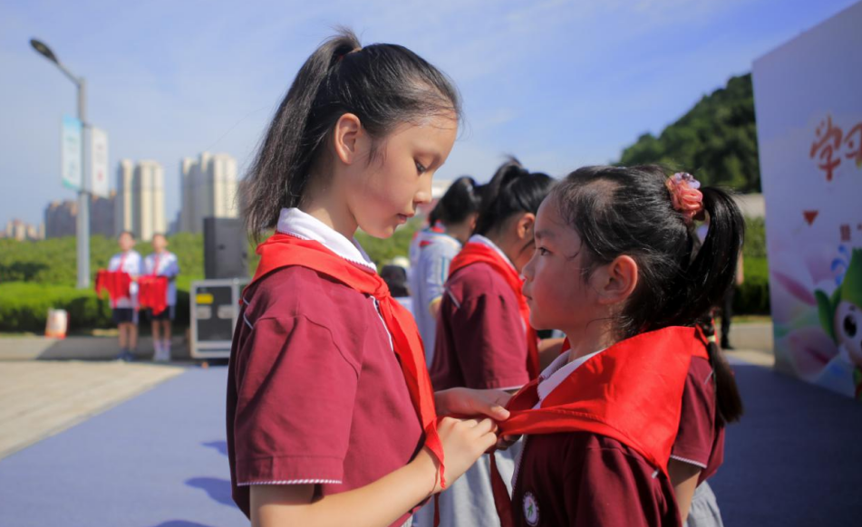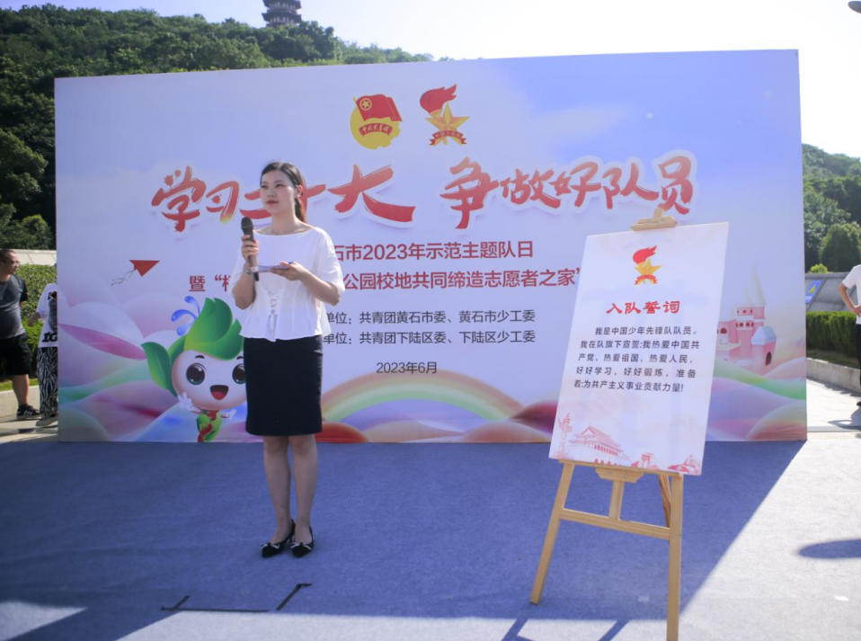 活动中,一批小学生光荣的加入了中国少年先锋队。在活动现场,领导嘉宾们为优秀的少先队员代表颁发“红领巾奖章”,有色小学大队辅导员张怡老师就如何引导少先队员践行、传承志愿精神,做共产主义事业的可靠接班人进行了发言。随后,由团市委、市城管委(市园林局)、下陆区委联合打造的柯尔山·白马山公园校地共同缔造志愿者之家正式揭牌。