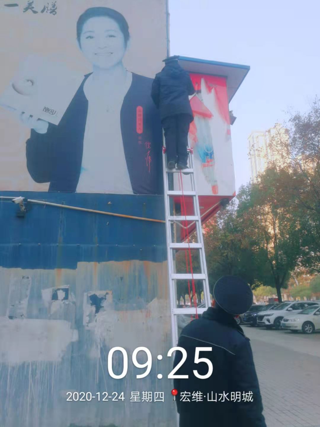 户外广告是城市管理的顽疾,不仅影响着城市环境和对外形象,也扰乱了城市管理秩序。2020年12月24日上午,下陆区城市管理执法局团城山市容中队队员化身为一个个“蜘蛛侠”,清除高处的破烂广告纸。以往大部分小广告通常都是贴在墙壁、橱窗、护栏上,顺手就可以直接清除掉。为了躲避清除,现在高空广告越来越多。为了清除高空广告,城管队员先在安全位置搭建好长梯,然后脚踩长梯,爬到高处,化身“蜘蛛侠”,用手中的小铲子等工具对广告纸进行铲除,另一个队员则在下方扶牢长梯,保证高空作业安全。 为了防止其死灰复燃,主干道各路段城管队员加大巡查力度,做到及时发现、及时清理,努力为市民营造一个干净整洁的市容环境。(柯玉泉)