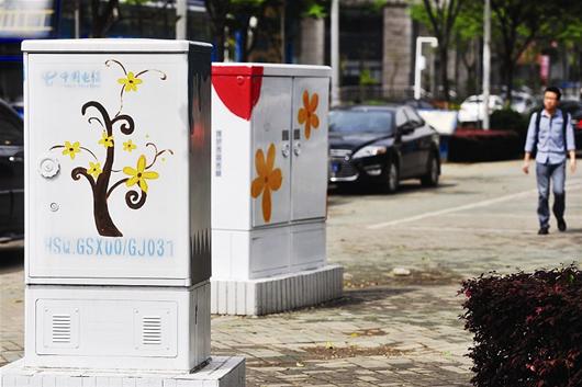 图为:“城管革命”让城市更美,图为光谷街头被精心装点的通讯设备箱 记者萧颢摄