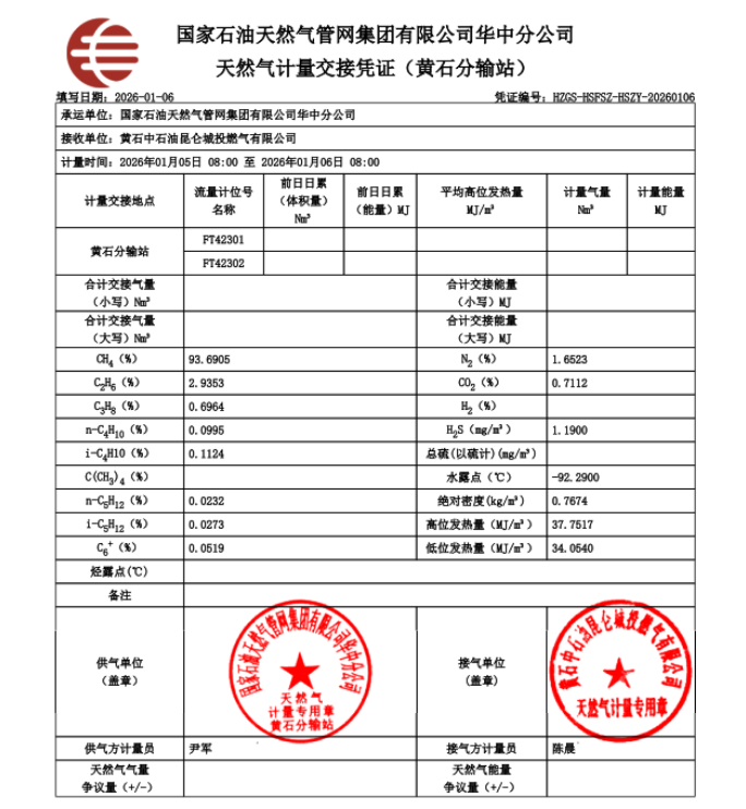 黄石市城区2026年1月份天然气气质报告公示